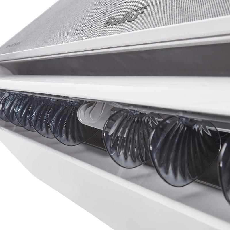 • Уникальные жалюзи - поворачиваются на 180°. Благодаря уникальной форме жалюзи можно направить поток воздуха вдоль потолка или пола. Благодаря форме штор можно отводить потоки воздуха от пользователя, создавая эффект мягкого охлаждения или эффект теплого пола.